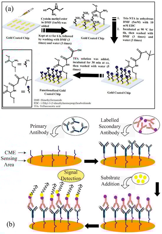 (a) Stepwise schematic representation of CME layer formation on the sensing area. (b) Stepwise graphical illustration of the detection method. Arrow direction shows the flow of the process. Reprinted from reference [].