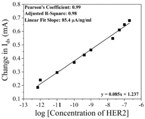 Change in the drain current for concentration of HER2 antigen in the range of 0.7 pg/mL to 200 ng/mL. Reprinted from reference [].
