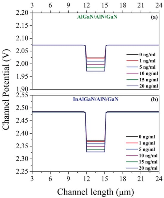 Distribution of the channel’s electrostatic potentials along the channel for the (a) AlGaN- and (b) InAlGaN-based HEMTs, with different concentrations of HER2 presented. Reprinted from reference [].