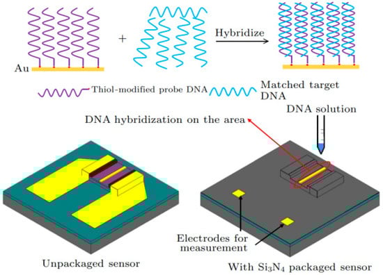 Zhang et al. studied Au-gated AlInN/GaN HEMT and AlGaN/GaN HEMT-based biosensors for DNA detection []. To detect specific DNA molecules, a thiol-modified probe DNA sequence must be immobilized on the Au surface, as illustrated in Figure 10. In their research, the sequence 5′-HS-(CH2)6-ATACCAGCTTATTCAATT-3′ was synthesized as the thiol-modified probe DNA, enabling the detection of only its complementary target DNA sequence, 5′-AATTGAATAAGCTGGTAT-3′. When the DNA immobilized on the sensing region matches the target DNA, the surface potential changes, allowing for the detection of the target DNA through monitoring variations in drain current.