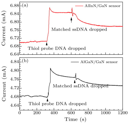 Figure 11 presents the time-resolved detection of DNA for both AlInN/GaN HEMT and AlGaN/GaN HEMT-based biosensors using the same concentration and volume of thiol probe DNA solution and target DNA solution. The current change observed in the AlInN/GaN HEMT-based biosensor is greater than that in the AlGaN/GaN HEMT-based biosensor, suggesting that AlInN/GaN may be more suitable for DNA detection sensors. When thiol probe DNA is applied to the Au gate, the drain current rapidly increases due to the formation of Au-S bonds, as Au atoms attract electrons from sulfur atoms []. These bonds introduce additional positive charges on the Au gate surface. The positive charges are neutralized by the negatively charged target DNA molecules in the aqueous solution, resulting in a decrease in drain current when the target DNA is added.