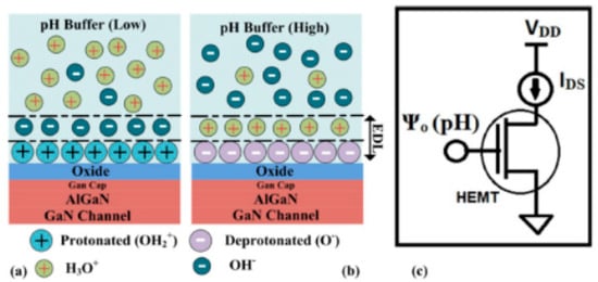 Schematic illustration of charge formation at the oxide/electrolyte interface in (a) acidic PBS, (b) basic PBS, and (c) simplified equivalent model depicting signal transduction for AlGaN/GaN HEMT-based sensor. Reprinted from reference [].