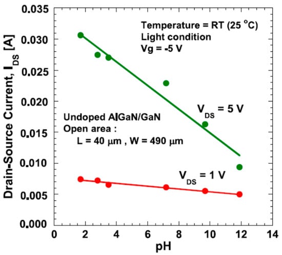 The measured drain current of AlGaN/GaN HEMT-based biosensor under various pH values. Reprinted from reference [].