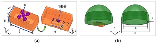 The antenna structure proposed in this paper and its specific sizes are shown in Figure 1. The antenna structure is composed of a large rectangular cavity. Five circular slot structures are embedded on the upper surface of the rectangular cavity for electromagnetic wave radiation. Five NOA73 spherical lenses (SUNNY OPTICAL TECHNOLOGY (GROUP) Co., Ltd., Yuyao, China) are embedded in the circular holes of the rectangular cavity for preliminary focusing of electromagnetic waves. The corresponding width and height of the waveguide feeding ports are designed to be l1 = 2.54 mm and w1 = 1.27 mm, and the sizes of the radiation waveguide are l2 = 6 mm, w2 = 2.54 mm, and h2 = 1.27 mm, respectively. The circular radiating port radius is set to R = 0.503 mm. A radome is placed above the waveguide Lens antenna to improve the gain and directivity of the antenna via electromagnetic wave dual-focusing.