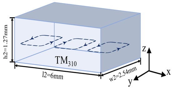The waveguide radiation structure is composed of an oversized rectangular cavity, which consists of a main TM310 mode cavity and five circular radiation apertures at the top of the waveguide. It has a relatively larger cavity that can easily reduce the implementation sensitivity for the W-band. The WR-10 feeding port is designed to be located at the bottom of the waveguide. The antenna can provide over double the radiation slots needed to achieve a higher element gain using a simpler structure. The magnetic field of the mode is depicted in Figure 2.