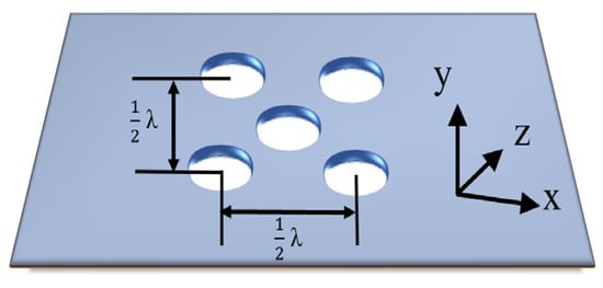 To enable the waveguide to achieve radiation, the slots are added to the top surface of the waveguide. The locations of the five radiation slots are shown in Figure 3. One of the slots is in the center of the radiation surface and others are divided into two groups along the x-axis and y-axis with a space of half a wavelength and they are placed a quarter of a wavelength far from the middle slot to achieve an in-phase distribution. To support a uniform distribution, all radiation slots have the same dimension. Due to the effect of the feeding structure, the electromagnetic field distribution is not as exactly uniform as expected. And, the optimum size of the antenna is decided using ANSYS Electronics Desktop 2017 software, version 23.2.