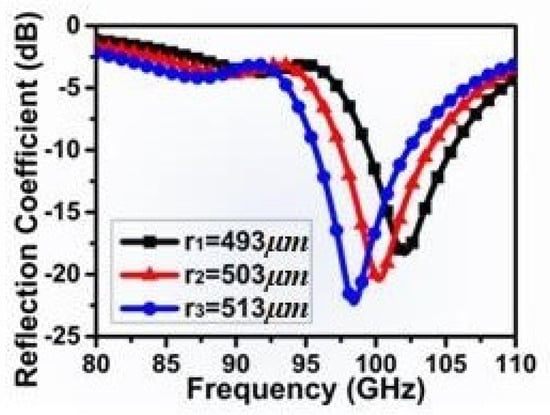 Simulation results of the reflection coefficient of the aperture antenna with different radiuses has shown that the center frequency decreases with the increasing diameter of circular aperture in Figure 4. This parameter can be used to tune the resonant frequency of the antenna and recognize the size of the circular aperture. Therefore, this provides a new method to detect molecules adopting antennas of higher frequency. When adapting the diameter of 503 µm and the center frequency of 100 GHz for research, the bandwidth can reach 8 GHz.