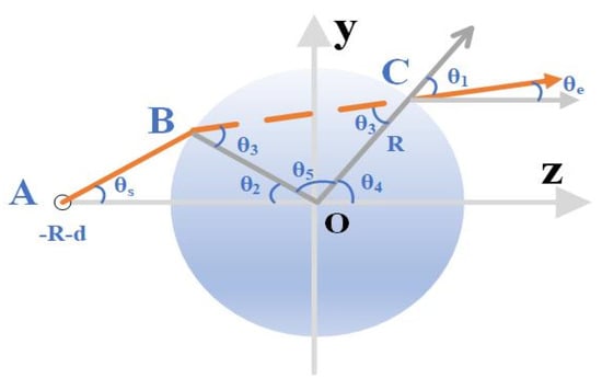 The geometry of the electromagnetic wave transmission in the Lens has been shown in Figure 5 and the combined ray-optics method has been used as follows. In this case, before escaping out of the spherical dielectric Lens, each ray will go through double refraction and be divided into three parts. Two refractions occur when rays enter and exit the Lens, respectively, at the points of B and C in Figure 3. Then, we start to track the rays. Firstly, the angle of incidence of the ray θs can be defined using Formula (2) []: