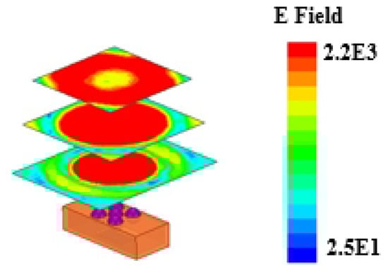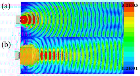 The designed waveguide Lens structure has a d/R of about 1.67. The feed port of the Lens antenna is not at the focus of the Lens, according to the ray diffraction method. As a result, the loaded Lens can only focus the electromagnetic wave to a certain extent while making it completely collimated. Electromagnetic simulation software based on the finite element method is adopted in the simulation procedure. This method can be used to solve cavity problems and antenna coupling precisely. The electric field distribution calculated using the electromagnetic simulation software is shown in Figure 6.