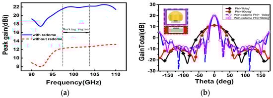 The antenna radome can refocus the electromagnetic wave to realize the enhancement of gain again. According to the finite element method, the performance of the dielectric Lens antenna has improved through the reasonable design and the simulation of the antenna radome. The whole structure is simulated and optimized via electromagnetic simulation software. The simulated result in Figure 7a shows the comparation of peak gain in the working region without the radome and with the radome. The result has shown that the peak gain has great improvement around 10 ± 0.5 dBi in the working region. In addition, Figure 7b has shown that without the radome the half power beamwidth is 46°, while adding the Lens radome over the antenna reduces the half power beamwidth to 17°. Without the radome, the gain in the Lens antenna is close to 12.5 dBi at 100 GHz. The simulation’s gain increases to around 22 dBi after the radome is added. The main lobe width is reduced and the antenna radiation is concentrated, thereby improving directivity, as shown in Figure 8. Furthermore, this Lens antenna has a lower first sidelobe of −5 dBi in the E plane and 0 dBi in the H plane. As a result, the Lens radome reduces the impact of the outdoor environment on its use.