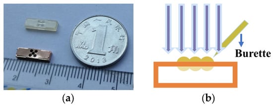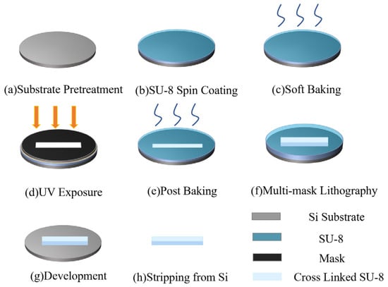The UV-LIGA process was used to prepare the cavity structure. The fabrication process steps shown are as follows [,]: Firstly, a silicon chip was adopted as the substrate to evenly apply SU-8(KAYAKU MICROCHEM Company, Hong Kong, China). The thickness of the SU-8 layer in this process controlled the speed and operation time of the spin coater. After spinning, the SU-8 layer is completed; soft baking was executed in Figure 9c. UV exposure is performed in Figure 9d after the sample has been soft-baked. The temperature, time of the soft baking process, and the ultraviolet light dose are determined using the thickness of the SU-8 layer. Finally, the post baking was completed. The processing steps for each SU-8 layer are the same as described above. Following the completion of all operations, the sample was developed and stripped from the silicon chip. The cross-linked SU-8 layers form the structure.