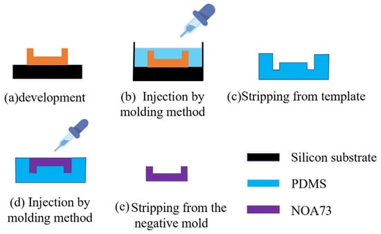 The MEMS technology also produces a negative mode with PDMS in Figure 11, so that the cavity can be duplicated quickly. Duplication of the materials can adopt NOA73 similarly. This method reduces the processing cost and improves the processing efficiency to a certain extent.
