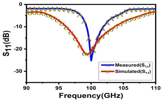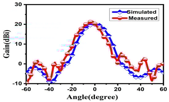 Figure 12 shows the bare WR-10 waveguide antenna mounted on the WR-10 feeding port connected to the expansion module. In Figure 13, the reflection coefficient firstly reduces with aggrandizing frequency and then one relaxation peak appears at frequencies around 100 GHz. Compared with the result of simulated reflection coefficient, the result of the measured reflection coefficient has shown a narrow bandwidth and the center frequency is shifted a little to the right. The deviation in center frequency and bandwidth was mainly caused by the micromachining error and measurement error which are within a reasonable range. One of the reasons for the error is the sample height error caused by the inability to accurately control the thickness of the SU-8 during processing. In addition, the incorrect connection between the feed port and the spread spectrum module will lead to a large measurement error. The realized gain at 0° in the passband has been plotted in Figure 14. It shows a slightly skewed radiation pattern towards the top of the antenna. The measurement results have shown that the antenna design achieves the antenna gain at 0° of probably 22 dBi over the operating band and the fabricated Lens antenna exhibits an excellent pattern of symmetrical, clean, and low sidelobes.