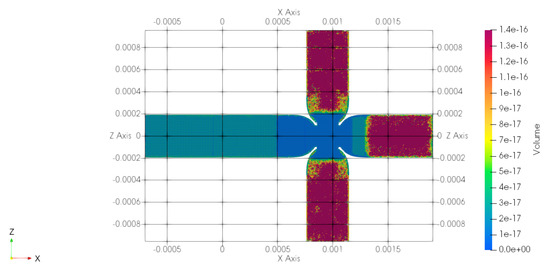 The dispersed phase enters from the channel along the x-axis and the continuous phase enters from the two channels along the z-axis. For all the inlets, the mass flow rate is imposed, and in the outlet section, a fixed pressure (p = 0) is considered as the boundary condition. The dispersed phase flow rate has been varied in the range of 0.6–7.5 mL/h, while the continuous phase flow rate has been fixed to 7.5 mL/h. The regime is laminar, as the Reynolds number calculated for the dispersed phase is , and , ranges from 0.5 to 6. The capillary number for the dispersed phase, ranges from 0.00005 to 0.0006, where N/m is the surface tension between the two fluids [11]. The capillary number for the continuous phase is . Then, the regime for droplet creation is the squeezing regime for all the cases in these ranges [11].