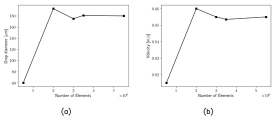 Five meshes have been built to check the grid convergence. The convergence has been proven by comparing the velocity and the diameter of the droplets as a function of the number of elements, as shown by Figure 3.
