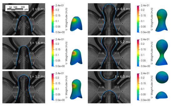 Moreover, the dynamics of the breakup phenomena in the experiments were compared with the results of the simulations. Figure 6 shows the comparison of the numerical data and the experimental data for the case with the dimensionless flow rate, defined as a ratio between the dispersed phase and continuous phase equal to 0.08. The 3D shapes of the interface are coloured with the velocity magnitude to highlight the zone where the acceleration is higher and compared with the corresponding picture in the experiments. The comparison shows that the simulations can accurately predict the drop geometries observed in the experiment, with an error on the time needed for breakup of about 5.3%.