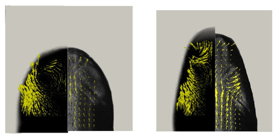 Finally, a comparison between the experimental and simulated velocity field in the mid-plane of the dispersed phase was performed. Figure 7 shows the velocity vector map obtained by the numerical simulations (left), together with the velocity vector map obtained by micro-PIV analysis (right), which has been mirrored. The vectors show a vortex in the thread nose, which is well known for droplets moving in two-phase flows [10]. The position and the dimensions of the vortexes obtained by the numerical simulation are in agreement with those obtained by the micro-PIV measurements. Furthermore, the velocity magnitude of the analysed fields is in agreement. In summary, we can conclude that the numerical simulations are in good agreement with the experiments both for the prediction of the dynamics of the droplet formation and for the velocity distribution.