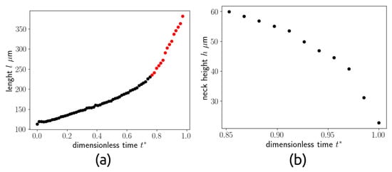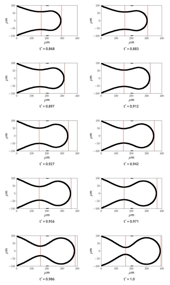 The dimensionless time has been obtained by dividing the time by the time interval between a droplet detachment and the successive droplet detachment, equal to 16.6 ms for the considered case (Q* = 0.08)). Figure 9a shows that the filling and necking phases last for most of the total time, while P1 increases slowly until (black dots), while for , it increases faster. Figure 9b also shows that the neck thickness decreases slowly for and drops very quickly for . The first time interval corresponds to the filling and necking phases, while the second one characterises the pinch-off stage. Figure 10 shows the evolution of the thread interface with time, from the first instant where the neck starts to be visible until the last time instant before the breakup. The dimensionless time has been obtained in this case dividing by the time duration of the necking stage.