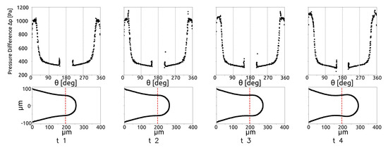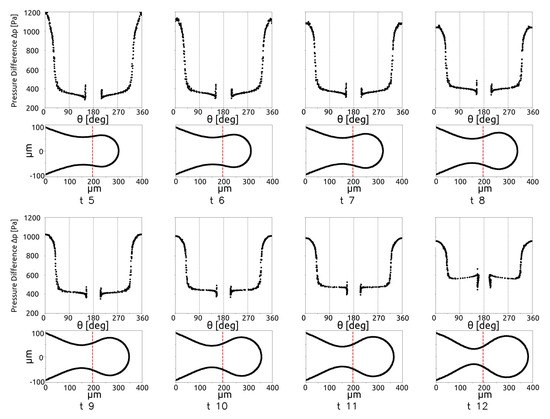 In Figure 11, the evolution of P1 and P2 are shown for = [0.08, 0.15, 0.25, 0.35, 0.65]. The figure shows that P1 increases proportionally to , in the necking phase, while the neck thickness P2 does not depend on , i.e., the neck collapses with the same trend in all the cases. This can suggest that the duration of the breakup is a key parameter of the droplet creation process. During the breakup phenomena, the main forces acting on the drop are shear-stress at the interface and the pressure differences between the two phases. In the squeezing regime, the effect of the pressure build-up is the most important [12], because the thread can occlude the micro-channel in the junction, then the pressure in the continuous phase increases, breaking the interface. To investigate this phenomena, the pressure difference between the phases is plotted along the interface during the process, as shown in Figure 12. The plot is made in polar coordinates, where the angle 0 is on the thread nose and the angle 180 is on the inlet section.