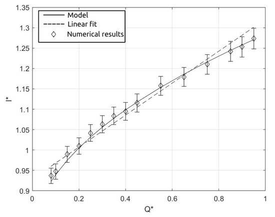 In the figure, the dimensionless length of the droplets obtained by the numerical simulations is shown by the symbols, while the continuous line refers to the results obtained by Equation (16), and the dashed line represents the linear fit described in Equation (8). The error between the numerical results and Equation (16) is less than 1%, showing a better fit with respect to the linear correlation, where the average error was around 1.3%. This result has been obtained on the basis of an energy balance on the emerging dispersed phase entering the continuous phase channel, accordingly with [25]. The result shows a dependence of the droplet dimensions with the volume flow ratio and on the Weber number. A similar dependence on the We number has been observed also by in T-junctions [27]. Here, the dependence on the Weber number evaluated in the junction emphasises the influence of the restriction of the junction which forces the continuous phase to flow at a higher velocity in the region near the neck. These results can be a basis for the optimal design of micro cross-junctions with restriction and flow-focusing devices for the production of drops with targeted diameters in the function of the inlet flow rates.