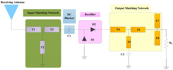 In the rectifying circuit of the RF energy collection system, due to the nonlinear characteristics of the rectifying diode, high-harmonic components are generated, which will flow back to the antenna for radiation again, resulting in energy loss. In the traditional rectifying circuit, the low-pass filter is used to suppress the high-harmonic components generated by the nonlinear rectifying diode to improve the conversion efficiency of the rectifying circuit. A broadband matching network is used in some wide input power rectifying circuits to increase the conversion efficiency [13,14,15].