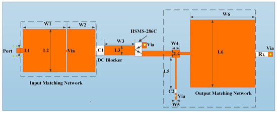 Figure 2 shows the layout of the proposed rectifying circuit. Simulation software ADS2021 was used to simulate the circuit model. The printed circuit board selected for the rectifier circuit was Rogers 4350b, with a dielectric constant of 3.48, a loss angle of 0.017 and a thickness of 1.524 mm. The optimized parameters of the proposed rectifying circuit are shown in Table 1.