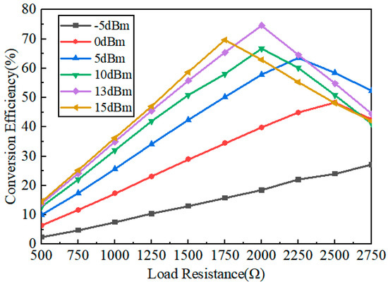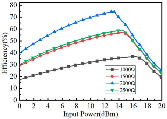 As seen in Figure 3, the simulated conversion efficiency is changed significantly with the load. When the input power Pin is 13 dBm and the load RL is 1000 Ω, the RF-to-DC conversion efficiency is 30%; under the same input power of 13 dBm with a load R of 2000 Ω, the RF-to-DC conversion efficiency is 74.8%. Therefore, it can be obtained that the output DC power of the rectifying circuit mainly depends on the output voltage and the output load, and the output load of the rectifying circuit is one of the key parameters affecting the overall conversion efficiency. The load can be adjusted to increase and improve the conversion efficiency within the predefined input power range.