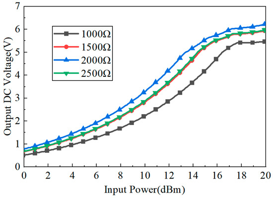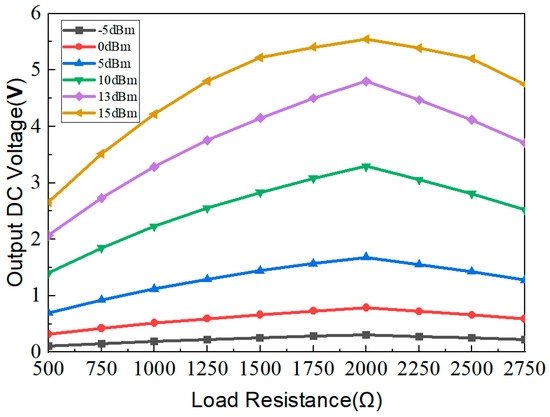 In the previous rectification antenna system, the conversion efficiency is closely related to the load and the input power, and the conversion efficiency is not the same for different loads. As seen from Figure 5, for a low input power, such as −5 dBm, the conversion efficiency increases nearly linearly as the input power increases. For an input power larger than 0 dBm, the conversion efficiency increase first with the input power, and then the conversion efficiency decreases; each input power corresponds to a load value with a maximum conversion efficiency. The proposed rectifying circuit can maintain a high rectification efficiency of more than 60% over the load resistance range from 1500 Ω to 2000 Ω. Figure 6 shows the output voltage under different load resistances and input powers. As seen from Figure 6, for a low input power, such as −5 dBm, the output voltage of the circuit changes very slightly, even though the load increases. When the input power increases, the output voltage of the circuit increases with it. For an input power larger than 0 dBm, the output voltage increases first with the load, and then the output voltage decreases; each input power corresponds to a load value with a maximum output voltage. As can be seen, the maximum output voltage occurs at 2000 Ω when the input power is 15 dBm.
