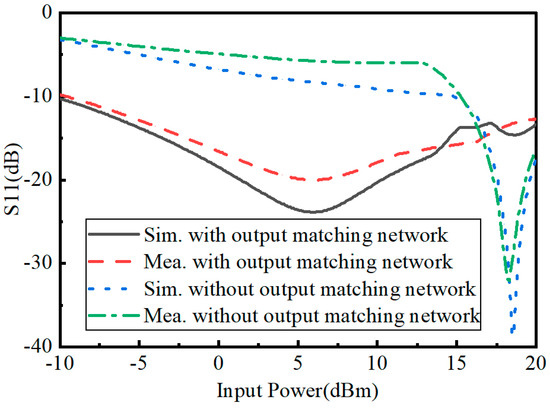 Figure 7. Measured and simulated S11 of the rectifiers with/without an output matching network versus input power.
