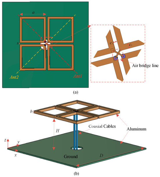 Figure 8. A 3D view of the proposed dual-polarized antenna. (a) Top view; (b) Side view.