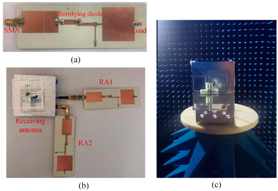 Figure 13 shows the fabricated rectifying antenna system and the antenna test setup in an anechoic chamber. The antenna radiation patterns were measured using the far-field test method The rectifying circuit was fabricated on a PCB Rogers 4350B with a dielectric constant of 3.48 and loss tangent of 0.017. The whole size of the rectifying circuit is 110 mm × 34 mm × 1.524 mm; the circuit port is connected with an SMA connector.