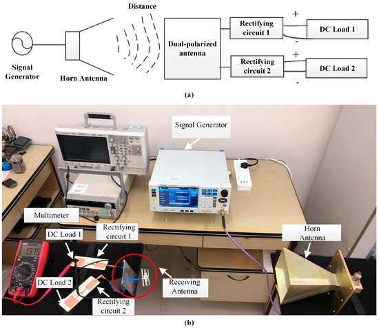 The wireless RF energy collection system experiment was conducted indoors; a measurement schematic and measurement setup are shown in Figure 14. The transmitting link consisted of a signal generator and transmitting horn antenna; the receiving link consisted of a dual-polarized cross-dipole antenna (receiving antenna), rectifying circuit and load.