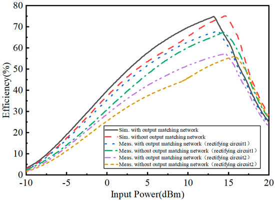 Figure 15 shows the simulated and measured efficiency of the rectifying circuit. In the simulation, the maximum efficiency reached 74.8% with the output matching network, when the input power was 13 dBm; the efficiency reached 74.9% without the output matching network, when the input power was 14.5 dBm. In the test, the efficiency of rectifier circuit 1 reached 68.03% with the output matching network, when the power was 13.6 dBm; the efficiency of rectifier circuit 1 reached 67.4% without the output matching network, when the power was 14.4 dBm. The efficiency of rectifier circuit 2 reached 57.2% with the output matching network, when the power was 14.5 dBm; the efficiency of rectifier circuit 2 reached 56% without the output matching network, when the power was 16 dBm.
