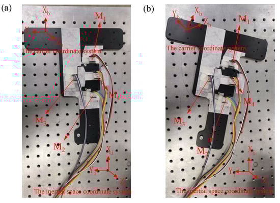 By incorporating six linear accelerometers in the body frame, it becomes possible to derive the angular velocity of each axis within the system by solving the accelerometer output. This information can then be utilized for attitude calculation. In this study, we have employed a twelve-accelerometer configuration scheme consisting of four three-axis accelerometers. This configuration scheme utilizes redundancy to compensate for system errors, thereby enhancing the overall accuracy. Furthermore, it ensures that the sensitive directions of the accelerometers mounted along the same axes are mutually orthogonal, making it well suited for installation in narrow spaces []. The specific arrangement of the twelve-accelerometer array is depicted in Figure 2, where M1~M4 represent the accelerometer mounting points, and A1x~A4z denote the mounting directions of the corresponding sensitive axes. For more information on the specific mounting position and sensitive directions of the twelve-accelerometer array, please refer to Table 1.