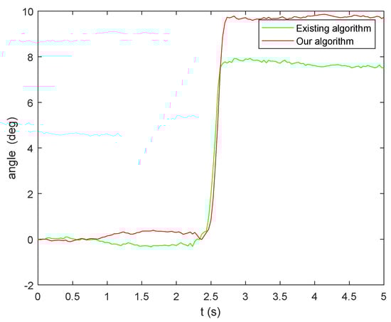 Subsequently, the results obtained from the two aforementioned algorithms are input into the quaternion equation for calculation, and the resulting angular calculation error is presented in Figure 7. Notably, the algorithm proposed in this paper exhibits significantly higher solution accuracy compared to the existing algorithm. This improvement can be attributed to the utilization of the sliding window method, which effectively eliminates anomalies near the zero value.