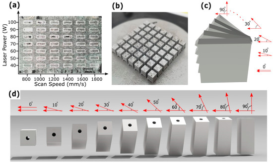 SLM Sample Preparation and Experimental Design: (a) single scan tracks for hatch space estimation; (b) cubes produced for density and surface roughness measurements; (c) cuboids oriented at varying angles for surface roughness assessment; (d) channel cuboids designed for orientation dependent printing.