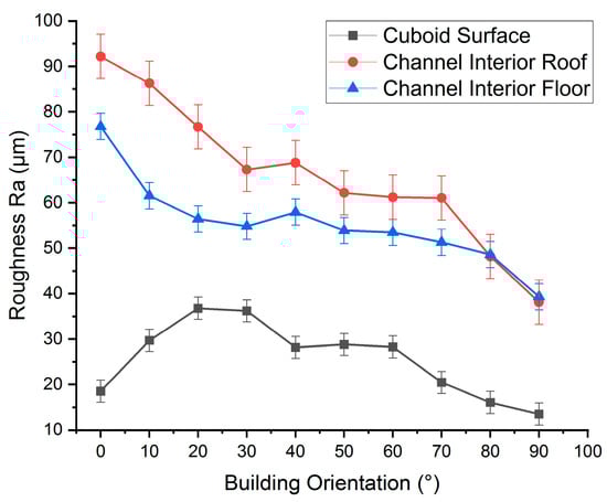 Cuboids printed in a stack, as described in Section 2.2 and Table 2 (group c), exhibited a significant variation in channel surface roughness relative to build orientation. As shown in Figure 2, the cuboid printed at a 0° orientation had a low surface roughness of 18.5 µm, which increased to 29.7 µm at a 10° build angle and further to 36.7 µm at 20°. The lower surface roughness at 0° is primarily due to a temperature gradient between the laser and solidifying material that balanced shear forces against surface tension, leading to smoother surfaces [83]. Additionally, the finer texture is aided by the overlapping curvature of individual melt tracks [84]. These combined thermal and geometric dynamics resulted in notably lower roughness at this angle. As the build angle increased beyond 0°, surface roughness also increases, largely because of the stair-step effect. The surface roughness pattern tended to increase between angles of 0° and 20°, then became linear at 30°. At 40°, surface roughness decreased to 28.1 µm and further to 22.8 µm at 50° due to the powder particles adhering to areas where loose powder meets the molten material, particularly at the outer edge of the contour scan track [83]. This powder adherence mechanism is assumed to smooth out the stair steps. Between 40° and 60°, surface roughness changed little, affected by both the stair-step effect and powder adherence mechanism [85], equating to the average size of the powder particles. Beyond 60°, surface roughness linearly dropped, reaching 13.5 µm at 90°. This is due to the decreasing stair-step effect with an increasing angle, with the lowest surface roughness at 90° occurring due to melt pool instability and thermal gradients [86,87].