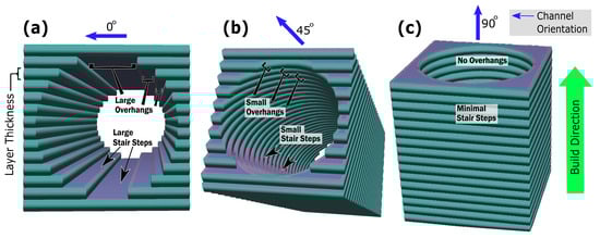 An illustration of impact of build orientation on channel surface roughness: (a) layer slicing horizontal channels at 0° orientation resulting larger overhang areas and stair steps; (b) channels at 45° orientation with smaller overhang areas and smaller stair steps; (c) vertical channels at 90° orientation exhibits no overhangs and minimal stair steps.