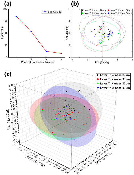 Following the identification of the need for specialized process parameters in confined geometries, cuboids featuring a 1 mm diameter interior channel were printed with layer thicknesses of 20 µm, 30 µm, 40 µm, and 50 µm using varying laser powers and scan speeds, as detailed in Table 2 (groups d–g). The results revealed a complex interaction between the process parameters, channel surface roughness, and material density. Principal Component Analysis (PCA), a statistical tool, transformed this complex dataset into a smaller set of uncorrelated variables and identified patterns in the data by highlighting similarities and differences. The first three components accounted for over 95% of the total variation, indicating their significant influence, as shown in Figure 4a. Specifically, PC1 explained 53.6% of the variance, underscoring its primary effect, while PC2 and PC3 contributed 33.8% and 7.7%, respectively. This indicates that PC1 is responsible for separating the datasets, confirming discernible differences between the datasets. Figure 4b presents a 2-D plot showing the distribution of data according to PC1 and PC2, while Figure 4c presents a 3-D plot showing the distribution of the first three components. A layer thickness of 20 µm has a larger confidence ellipsoid with greater variability; less overlapping might be preferable for diverse outcomes and this thickness showed more distinct variations of parameters. The ellipsoids of layer thickness 30 µm, 40 µm, and 50 µm showed few variations, and more overlapping indicates that these groups are more consistent with each other. The distinct separation observed in the plot revealed clear differences in the results based on the process parameters.