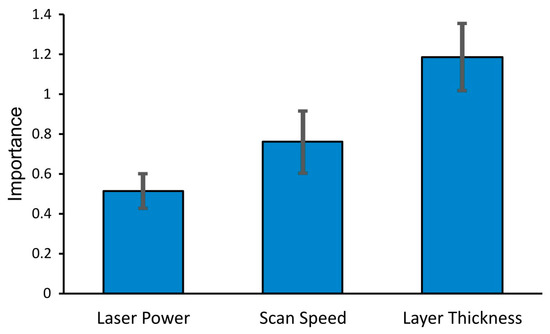 Random Forest Machine Learning (RF-ML) modeling of the data from Table 2 (groups d–g) yielded the model’s performance, as indicated by the Root Mean Squared Error (RMSE) of approximately 9.09. This value reflects the average deviation of the predicted channel surface roughness values from the actual measurements in the dataset. The permutation importance graph, shown in Figure 5, revealed that layer thickness has a substantial effect on the channel surface roughness, with an importance score of 1.184. This suggests that variations in layer thickness significantly influence the surface quality of the printed channels, potentially due to the stair-step effect and variations in melt pool shape. In comparison, scan speed and laser power also showed notable importance, with scores of 0.758 and 0.512, respectively, indicating their roles in determining channel surface roughness, albeit to a lesser extent than layer thickness. The greater influence of scan speed over laser power could be due to the fact that scan speed directly controls the duration of laser interaction with the metal powder, thereby affecting the amount of energy deposited per unit time. This variation influences the consolidation rate, which is reflected in the channel surface roughness. Meanwhile, laser power governs the temperature gradient within the melt pool and the overall energy input, which in turn affects heat conduction into the adjacent powder and contributes to channel surface roughness due to powder adherence. These findings from the RF-ML analysis underscore the criticality of precise parameter control in SLM processes, particularly for achieving the desired surface quality in complex internal geometries like interior channels.