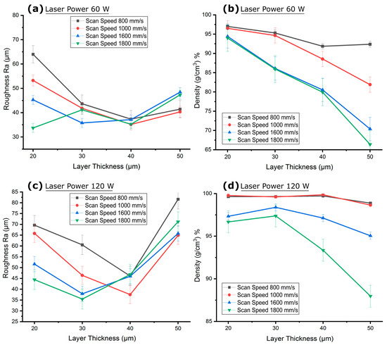 Effects of layer thickness on the channel surface roughness and density of 1 mm fluidic channels at different scan speeds: (a) channel surface roughness variation at 60 W laser power; (b) density variation at 60 W laser power; (c) channel surface roughness variation at 120 W laser power; (d) density variation at 120 W laser power.