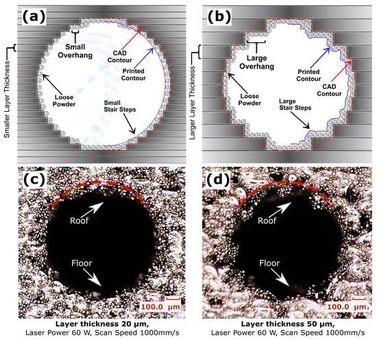 Impact of layer thickness on surface finish and overhangs: (a) small layer thickness leading to more pronounced channel surface roughness due to powder adherence, yielding a finer surface; (b) Large layer thickness resulting in increased channel surface roughness due to large stair steps and more significant overhang areas; (c) Optical microscopy image of a channel printed with a 20 µm layer thickness, showing a relatively finer inside surface; (d) Optical microscopy image of a channel printed with a 50 µm layer thickness, displaying poorer surface characteristics.