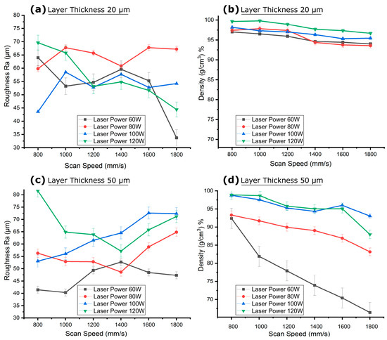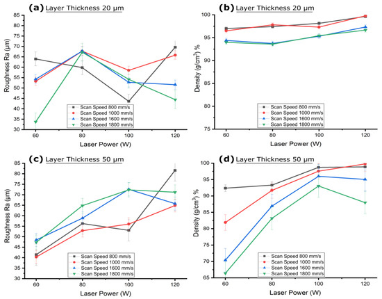 Effects of laser power on the channel surface roughness and density of interior channels: (a) Channel surface roughness variation at various laser powers for layer thickness of 20 µm; (b) Density variation at various laser powers for layer thickness of 20 µm; (c) Channel surface roughness variation at various laser powers for layer thickness of 50 µm; (d) Density variation at various laser powers for a layer thickness of 50 µm.