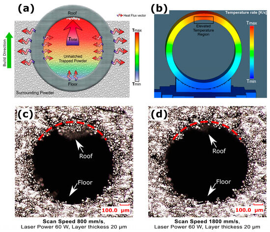Factors affecting 1 mm diameter horizontally printed channel surface quality and overhang roof: (a) heat penetration into trapped powder increases powder adherence, especially at the channel roof; (b) FEA simulation of the channel’s manufacturing process showing a thermal gradient along the z-axis with elevated temperatures at the roof; (c) Optical microscopy image of a horizontal interior channel’s cross-sectional surface profile at scan speed 800 mm/s, laser power 60 W and layer thickness 20 µm, illustrating droplet phase formation at the roof due to sagging from longer consolidation times; (d) Optical microscopy image of a horizontal channel surface profile at a higher scan speed 1800 mm/s with same laser power and layer thickness, showing reduced roof sagging due to shorter consolidation time.