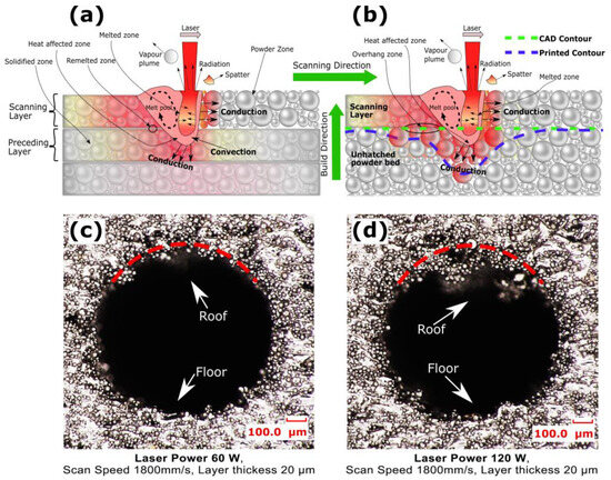 Factors affecting floor and roof formation in SLM printed horizontal channels: (a) laser scanning and welding process of scanning layers onto the preceding floor layer; (b) Overhang deviation during roof formation over the unhatched powder zone; (c) Optical microscopy image of the cross-sectional channel surface profile at a laser power of 60 W, scan speed of 1800 mm/s, and layer thickness of 20 µm; (d) Optical microscopy image at a higher laser power of 120 W printed with the same parameters.