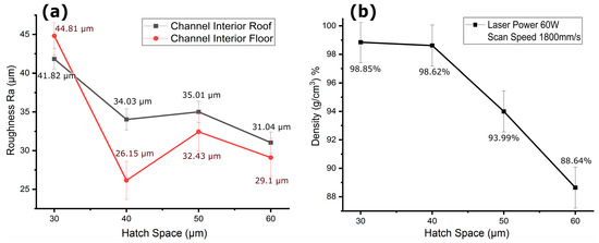 Effect of hatch space on surface roughness and density of SLM 3D horizontally printed 1 mm diameter interior channel: (a) roof and floor roughness variation at various hatch spaces, for sample printed with laser power 60 W, scan speed 1800 mm/s and layer thickness 20 µm; (b) density variation at various hatch spaces.