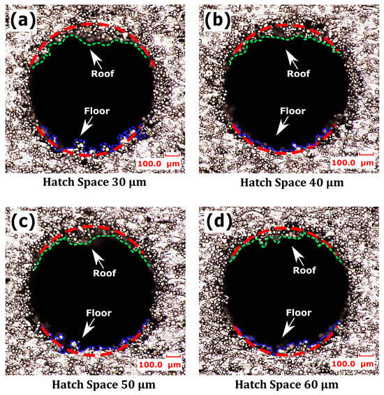 Optical microscopy of horizontal interior channel’s cross-sectional surface, showing roof and floor profiles at laser power 60 W, scan speed 1800 mm/s and layer thickness 20 µm across hatch spaces from 30 µm to 60 µm (a–d). The red colored dotted lines represent the CAD-designed contours within the channel, the green dotted lines illustrate the upper boundary of the printed contour at the roof and the blue dotted lines show the lower boundary of the printed contour of the floor. This delineation highlights the variations in the surface profile attributable to changes in hatch space.