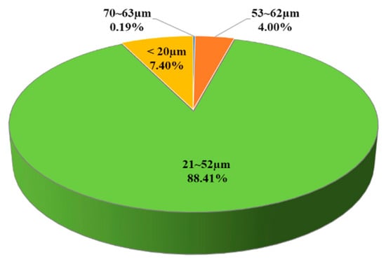 The study used the powder of Tongtai Corp. SS-316L to carry out the 3D printing of the metal materials. The manufacturer number is 3354574. The metal particle size is shown in Figure 1. The highest particle size distribution is about 36.5 ± 15.5 µm. Figure 2a is the schematic diagram of the metal 3D printing. The metal 3D printing facilities used Tongtai AMP-160 to print tensile and block specimens. Table 1 shows the printing processing parameters []. Figure 2b is the schematic diagram of subtractive manufacturing in the SS-316L plate. The original material dimensions of the cold rolled steel are W350 mm × L1219 mm × t3.0 mm and W1219 × L3048 mm × t10.0 mm. The tensile specimen’s original dimensions are W350 mm × L1219 mm × t3.0 mm. The impact specimen’s original dimensions are W1219 × L3048 mm × t10.0 mm. The cross-section reduction is about 15–25% after the rolling process. The grain size is about 20–50 µm. Figure 2c represents the standard scale of impact and tensile specimens. We used the subtractive process to manufacture the tensile and impact specimens according to the scale of Figure 2c. The scales of the impact and tensile specimens are according to the ISO 6892-1 design specifications [].