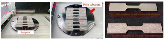 Figure 6a,b show the tensile specimen with import support scaffolding and non-support scaffolding design after the 316L SS printing of the tensile specimen materials. Figure 6c shows the manufactured tensile specimens by laser subtraction. The average value of the warping and distortion is 0.46 ± 0.05 mm with support design, and the average value of the warping and distortion is 0.1 ± 0.03 mm without support design after the tensile specimen is manufactured by 3D additive printing, as shown in Figure 6a,b. The average value of the warping and distortion was 0.23 ± 0.03 mm when the tensile specimens were manufactured by laser subtract processing, as shown in Figure 6c. We realize that the support scaffolding will cause warping and distortion in the specimens when 3D additive processing is used. This is due to the uniform temperature distribution, leading to the warping and distortion in the specimens. It is also called the stress residual in the specimens [,,].