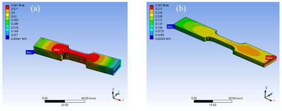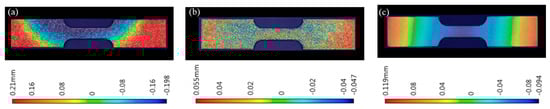 Support scaffolding is used to aid support when the materials are under the floating state in additive printing. For example, the process involves a printing shell or surface [,]. In addition, the workpiece will produce warpage and distortion after the selective laser melting processing []. Therefore, we used simulation and experimental software to investigate the phenomenon of warpage and distortion when the specimen additive was manufactured with support and non-support scaffolding. The measurement facilities use KEYENCE VR-6000 3D optical profilometer to measure the warping and distortion in the tensile specimen after the tensile specimen of the 316L SS is manufactured by 3D additive and subtract processing. Figure 5 shows the simulation results of the tensile specimen 3D additive manufacturing process. Figure 5a was designed with support scaffolding, and the height of the support scaffolding was designed to be 3.0 mm. Figure 5b was designed without support scaffolding. The software for the simulation is the Ansys workbench 2022 R2. The boundary conditions of the simulation are set according to Table 1. We found that the support scaffolding design of the specimen is higher than the design without support scaffolding in the index of the warpage and distortion, as shown in Figure 5a,b.